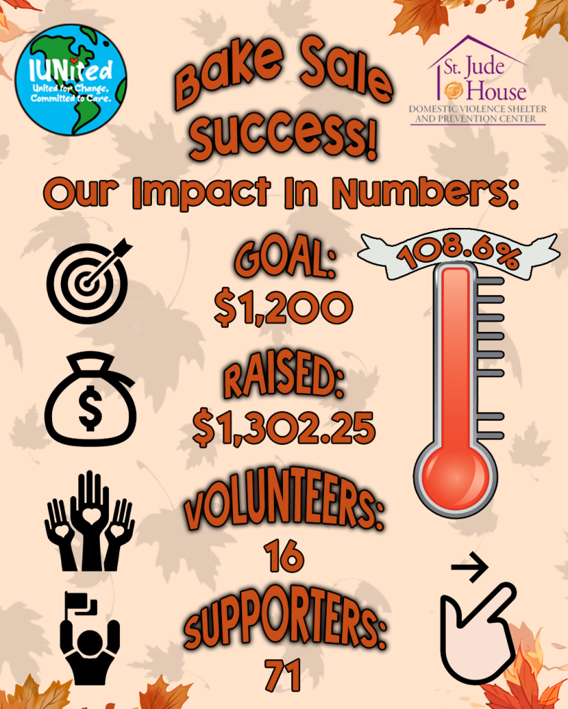 IUNited is proud to share the success of our 2025 Fall Bake Sale, where students came together with compassion, creativity, and purpose to raise $1,302.75 for St. Jude House, surpassing our original $1,200 goal. This achievement represents more than just numbers; it reflects the dedication and heart of our members, volunteers, and supporters who believe in giving back to our community.